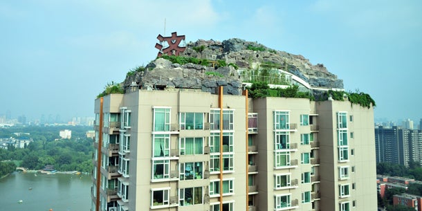 Eine ungewöhnliche "Felsenvilla" auf dem Dach eines 26-stöckigen Hochhauses in Peking muss wieder abgerissen werden. Das Ordnungsamt verfügte nach eigenen Angaben vom Dienstag die Demontage der zweistöckigen Garten- und Felsenkonstruktion innerhalb von nur 15 Tagen.