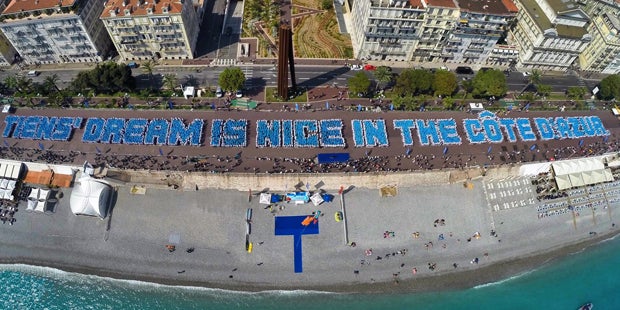 Mehr als 6.000 Angestellte eines chinesischen Unternehmens haben bei einer Europareise zum Firmenjubiläum einen neuen Weltrekord aufgestellt. Die Arbeiter formten am Freitag auf der berühmten Promenade des Anglais in Nizza mit "Tiens' Traum ist Nizza an der Cote d'Azure" den größten vom Himmel aus lesbaren Satz (siehe Foto oben). Überwacht wurde der Rekord von Mitarbeitern des Guinness-Buchs der Rekorde.