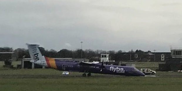Maschine der Billigairline Flybe setzte ohne das vordere Fahrwerk auf dem Rollfeld auf.