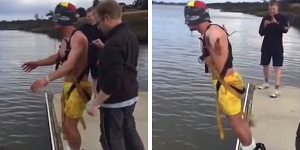 Etwas ganz besonderes haben sich die Freunde von Luke einfallen lassen. Sie zogen den armen Bräutigam in Spe bis auf die Boxershorts aus, verbanden ihm die Augen und sagten, dass er einen Bungee-Jump machen müsse.