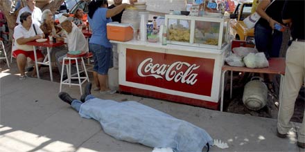 Die Mexikaner haben sich sichtlich an die Gewalt in ihrem Land gewöhnt. Das Foto aus Ciudad Obregon an der nördlichen Pazifikküste zeigt Einheimische, die sich beim Verspeisen der landestypischen Tacos nicht von einem Toten am Gehsteig stören lassen.