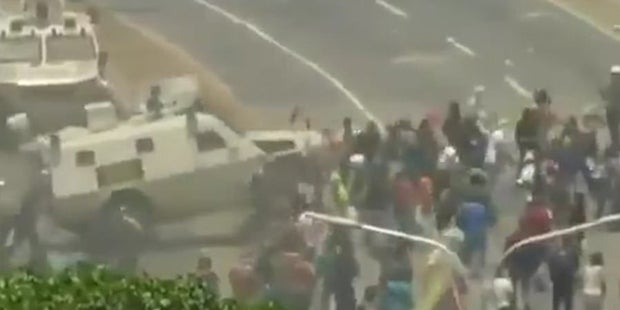 Ein Panzerwagen raste in die Menge, wie im kolumbianischen Fernsehsender RCN zu sehen war. Ob dabei Demonstranten verletzt wurden oder ums Leben kamen, war zunächst unklar. Nahe dem Luftwaffenstützpunkt La Carlota schleuderten Demonstranten Steine auf Nationalgardisten auf Motorrädern. Die Sicherheitskräfte feuerten Tränengaskartuschen in die Menge.