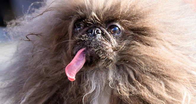 Seine Haare stehen in alle Richtungen und die Zunge hängt ihm wild heraus. Das scheint zu reichen, um nicht als besonders schön zu gelten. Bei dem Hund handelt es sich um eine Pekinesen-Rasse, der auf den Namen "Wild Thang" hört.