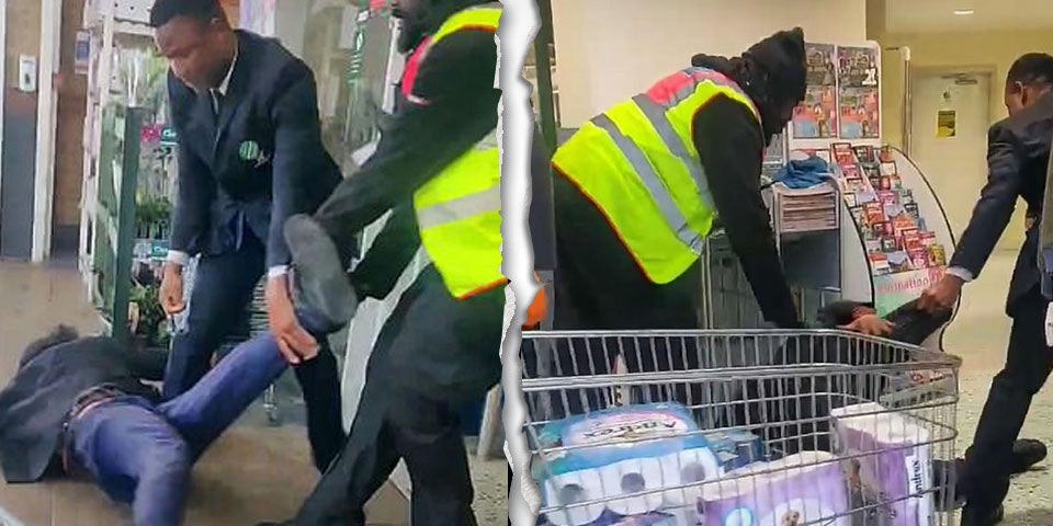 Schockierende Aufnahmen zeigen Securitys, die einen älteren Mann an seinen Füßen in einen Supermarkt schleifen. Sein Einkaufswagen war voller Toilettenpapier.