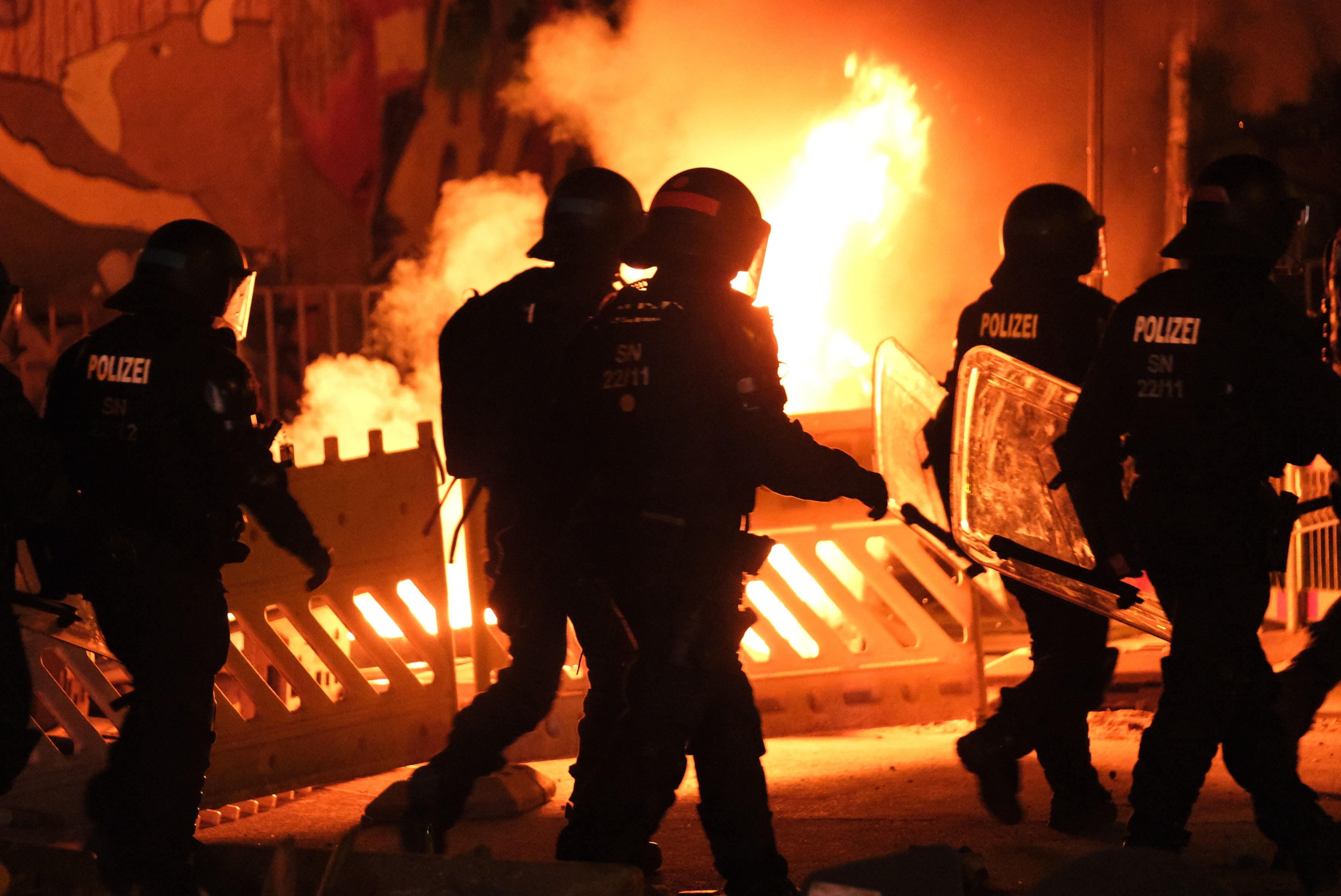 Wie die Leipziger Polizei mitteilte, bewarfen Demonstranten auf der Straße und auf Hausdächern Polizisten mit Gegenständen, errichteten Barrikaden und steckten diese in Brand. Mehrere Polizisten seien verletzt worden, außerdem habe es mehrere Festnahmen gegeben.