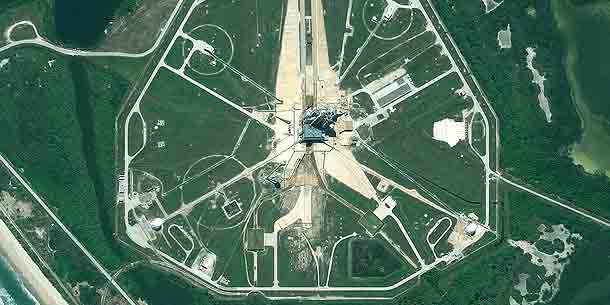 Das Kennedy Space Center in Florida von oben. Im Bild sieht man das Space Shuttle Endeavour vor seinem letzten Flug zur Internationalen Raumstation ISS.