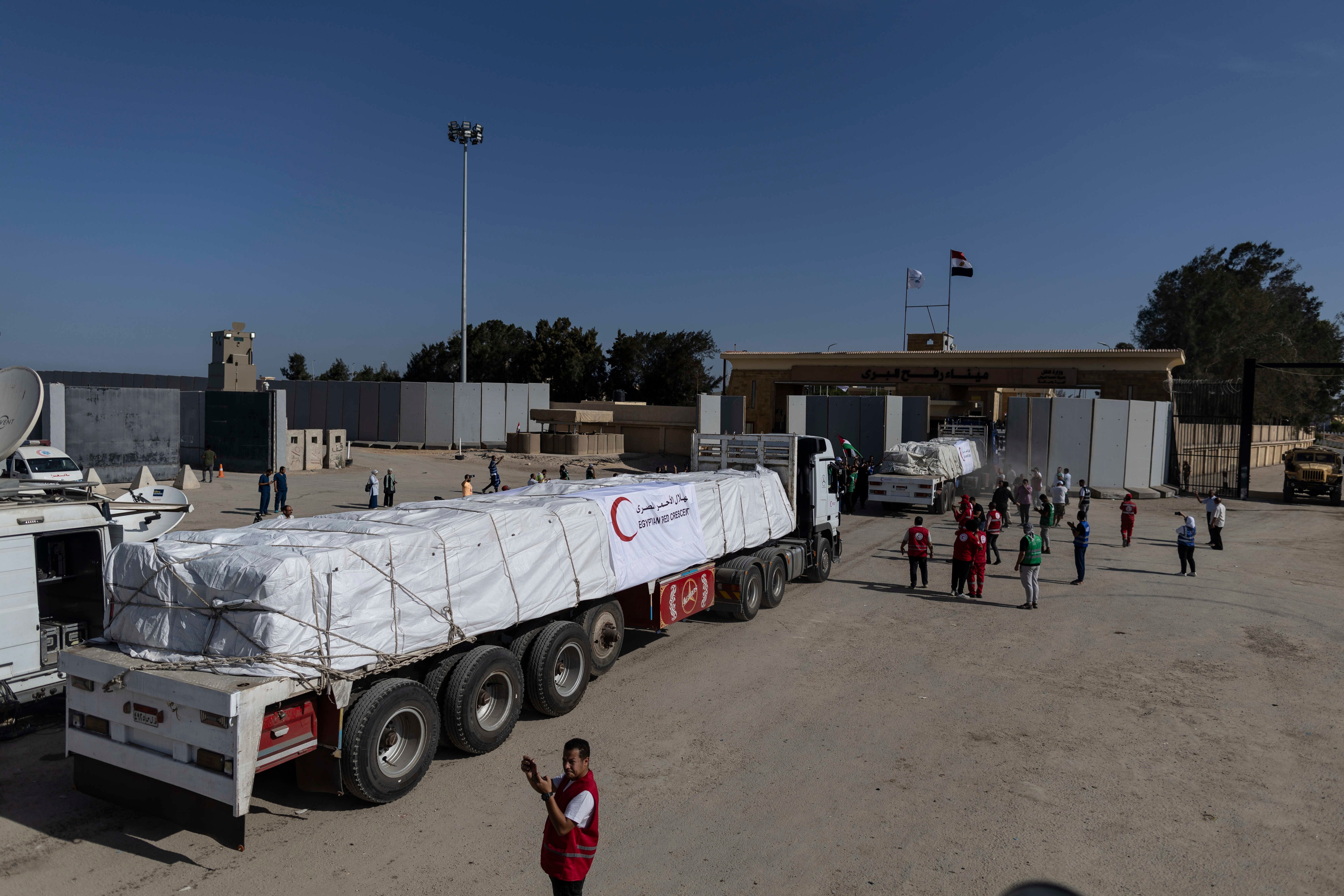 Rafah gilt als der einzige Weg, dringend benötigte Hilfe in den Gazastreifen zu bringen. Israel hatte einer Öffnung des Grenzübergangs für die Lieferung von Wasser, Lebensmitteln und Medikamenten zugestimmt. Die Lkw und Krankenwagen waren bei einem Großaufgebot an Sicherheitskräften zur Grenze gefahren. Auf einigen steht geschrieben: "Für unser Volk in Palästina".