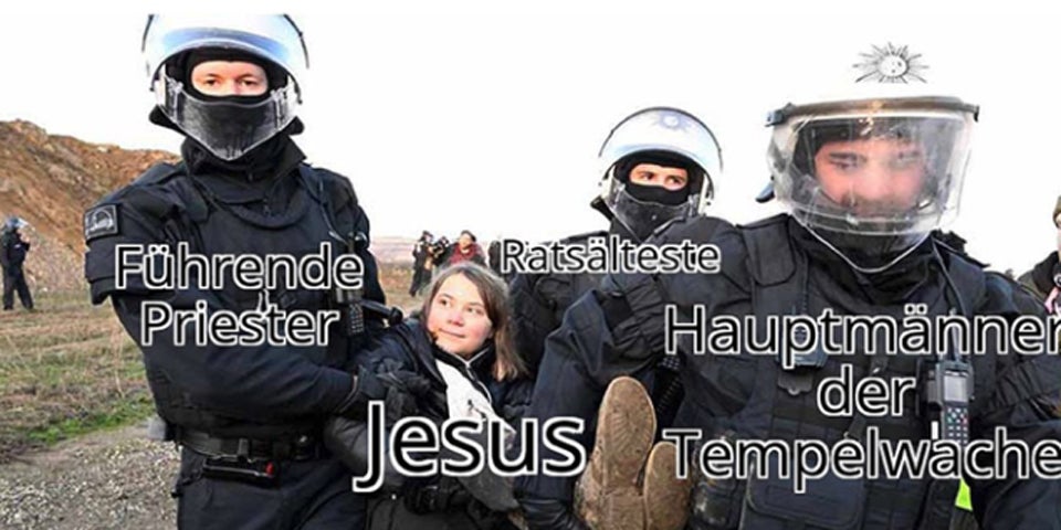 Im Posting wird Greta nun mit Jesus verglichen, die Polizisten mit den biblischen Verrätern. Dazu hieß es im Text „Judas küsst Jesus“.