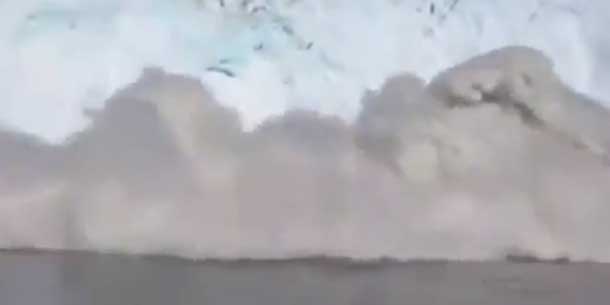 Eine beschauliche Touristenfahrt entlang der Gletscher in Grönland wäre beinahe dramatisch ausgegangen. Direkt vor den Augen der Touristen und vor laufender Kamera bricht ein gewaltiges Stück des Gletschermassivs ins Meer.