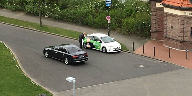 Dieses Foto sorgt derzeit für heftige Diskussionen im Netz. Darauf zu sehen: Die Grünen-Politikerin Sylvia Löhrmann, wie sie aus ihrem Dienst-Audi A8 in ein Hybrid-Auto mit ihrem Konterfei umsteigt. Umweltfreundlichkeit also nur für den Wahlkampf?
