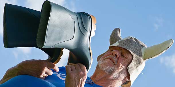 58 Männer und Frauen sind am Samstag in Würzburg zur Gummistiefelweitwurf-Meisterschaft angetreten. Bereits zum zweiten Mal hatte die Deutsch-Finnische Gesellschaft zu dem kuriosen Bewerb geladen. "Wir wollen das Bild der Deutschen über die Finnen positiv beeinflussen", sagte Organisatorin Karin Bayha. Gewinner der Spaß-Meisterschaft wurde der 21-jährige Andreas Zeuch. Der Würzburger schleuderte seinen Gummistiefel 36,30 Meter weit. Das ist freilich noch ausbaufähig: Der Weltrekord liegt bei 67 Metern.