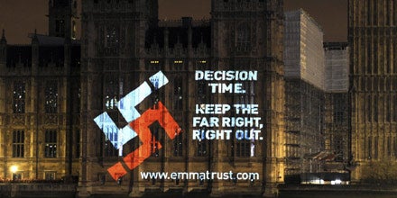 Als Warnung vor einem möglichen Erfolg der Rechtsextremen bei der britischen Parlamentswahl am Donnerstag haben Aktivisten ein Hakenkreuz an das Parlament in London gestrahlt. "Zeit der Entscheidung. Haltet die extreme Rechte draußen", schrieben sie in der Nacht zu Montag mit Lichtstrahlen neben das weiß-rote Hakenkreuz an die Fassade des Parlaments.