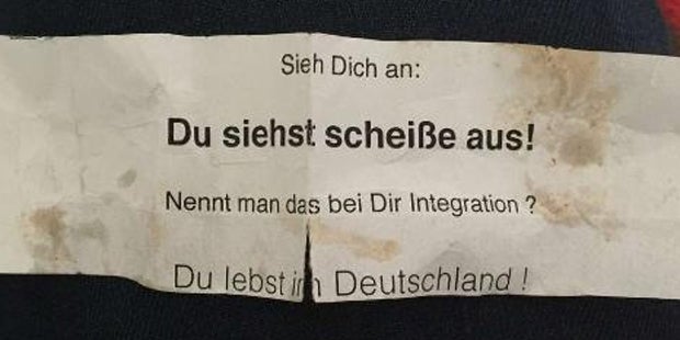 In Köln verteilen derzeit Unbekannte Hass-Zettel an Frauen mit Kopftuch. Auf den Zetteln ist zu lesen: "Sie Dich an: Du siehst scheiße aus! Nennt man das bei dir Integration? Du lebst in Deutschland!"