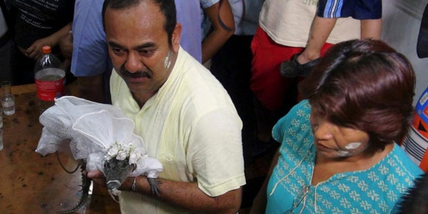 Braut mit spitzen Zähnen: Bei einer Zeremonie in Mexiko hat ein Bürgermeister ein kleines Krokodil symbolisch geheiratet. Das Reptil wurde vor dem hochzeitsartigen Fest von seinem künftigen Gatten Victor Aguilar Ricardez durch das Fischerdorf San Pedro Huamelula im südlichen Bundesstaat Oaxaca getragen und mit Blumen geschmückt.