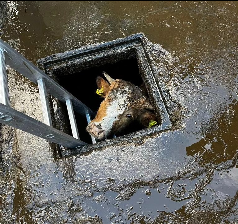 Er entdeckte Stier "Fridolin" in einer Öffnung im Boden. Das Kalb war in den engen Gülle-Schacht etwa 1,5 Meter in die Tiefe geplumpst.