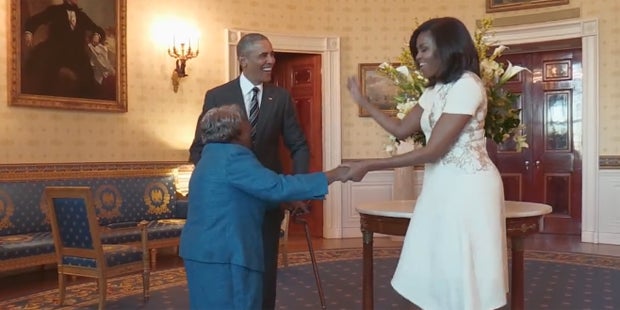 Mit Gehstock und guter Laune: Virginia McLaurin (106) hat sich ihren größten Wunsch erfüllt und US-Präsident Barack Obama (54) im Weißen Haus getroffen. Dabei legte die gut gelaunte Seniorin ein Tänzchen mit First Lady Michelle Obama (52) hin.