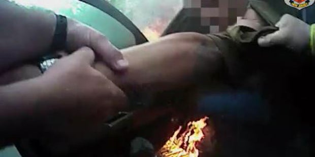 Das dramatische Video zeigt die Lebensretter, als sie den Mann aus dem Feuer ziehen.