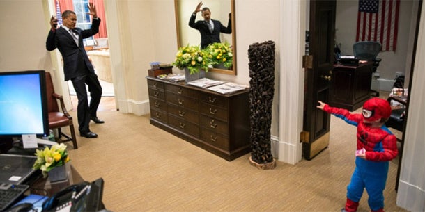 US-Präsident Barack Obama ist der mächtigste Mann der Welt - aber sogar er kann von noch mächtigeren Wesen überrascht werden. So geschehen, als er das Oval Office verließ und von keinem geringen als Spiderman gestellt wurde. Der Sohn eines Angestellten überraschte den US-Präsidenten in seinem Spiderman-Kostüm und tat so, als würde er ein Spinnennetz auf Obama schleudern. Der ließ sich nicht lumpen und spielte mit.