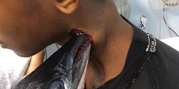 Fotos auf Facebook zeigen, wie der Fisch Muhammad in den Nacken trifft. Die lange, spitzige Schnauze des Hornhechtes schnitt gerade durch den Hals des 16-Jährigen und bohrte sich in den Hinterkopf. Der Jugendliche wurde umgehend in ein Krankenhaus gebracht und zwei Tage später operiert.