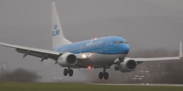 Ein dramatisches Video zeigt die Landung eines Passagiers-Jets am Flughafen in Manchester bei heftigem Wind. Die Boeing 737 der niederländischen Fluglinie KLM konnte dabei nur mit größter Mühe sicher landen.