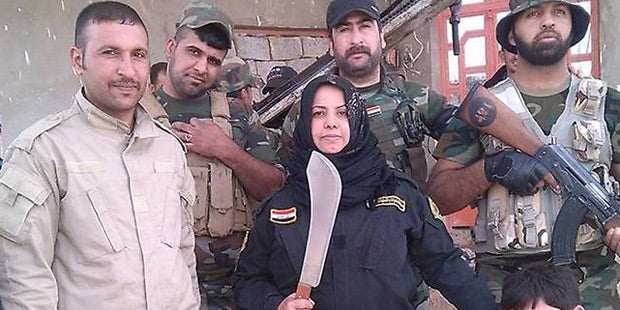 Um Hanadi ist im Irak inzwischen eine echte Berühmtheit. Meist trägt sie einen schwarzen Kampfanzug und einen Holster mit einer Pistole. Gerne posiert sie auf Fotos auch mit einer Machete und stellt die Aufnahmen auf Facebook.