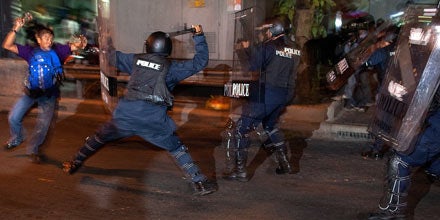 Die Polizei war am Freitagvormittag bis auf wenige Meter an die Front der Demonstranten herangerückt. Sie forderte den Abbau der Barrikaden aus Autoreifen und Zäunen mit spitzen Bambusstangen. Die Demonstranten verweigerten dies. Die Polizei zog sich schließlich zurück, während hinter den Kulissen hektische Vermittlungssuche liefen. Ein Ergebnis war bis zum Abend nicht in Sicht. "Wir stehen an der Schwelle der Anarchie und einem möglichen Regimewechsel", schrieb die Zeitung "Nation".