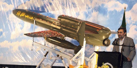 Irans umstrittener Präsident Mahmoud Ahmadinejad kostet seinen Triumph über die internationale Staatengemeinschaft nach der Inbetriebnahme des ersten Atomkraftwerks voll aus: Am Sonntag präsentierte er stolz einen unbemannten Langstreckenbomber als „Botschafter des Todes für die Feinde der Islamischen Republik“. Es handelt sich um die erste Drohne des Landes, die auch mit Bomben bestückt werden kann.