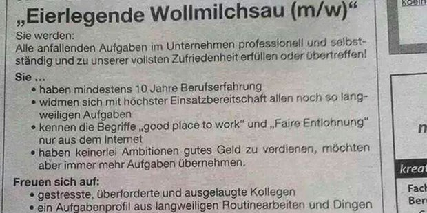 Kaum Lohn, dafür Überstunden en masse - Inserat sucht Eierlegende Wollmilchsau.