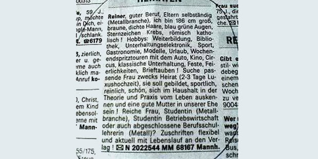 Zuerst beschreibt der Mann sich selbst: "Reiner, guter Beruf, Eltern selbständig (Metallbranche), ich bin 186 cm groß, braune, dichte Haare, blau grüne Augen, Sternzeichen Krebs, römisch katholisch", schreibt er zu Beginn der Annonce. Auch seine Hobbys, von denen er so einige hat, beschreibt er in Stichworten.