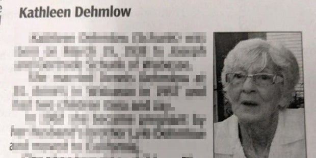 Todesanzeigen in Zeitungen sind an sich nichts Ungewöhnliches. Auch jene der verstorbenen Kathleen Dehmlow beginnt in den ersten zwei Absätzen wie viele andere Anzeigen - mit einem kurzen Lebenslauf: Die 1938 Geborene heiratete 1957 und bekam zwei Kinder, Gina und Jay.