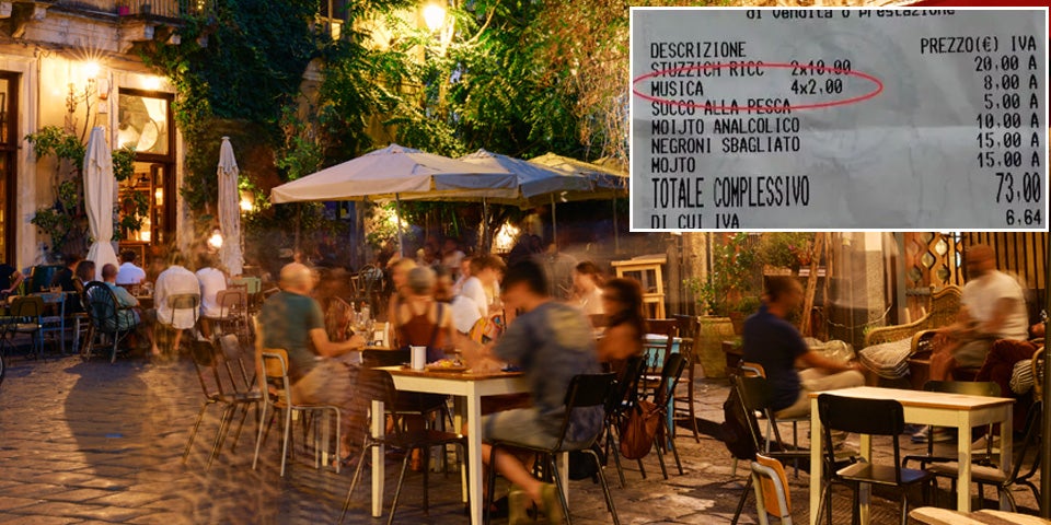 Sonne, Aperitivo, dolce vita. Doch für eine Urlauber-Gruppe im süditalienischen Ostuni endete der Abend mit einer bösen Überraschung. Auf ihrer Restaurant-Rechnung tauchte neben Getränken und Snacks ein Posten auf, der sprachlos macht: „Musica – 2 Euro pro Person“.