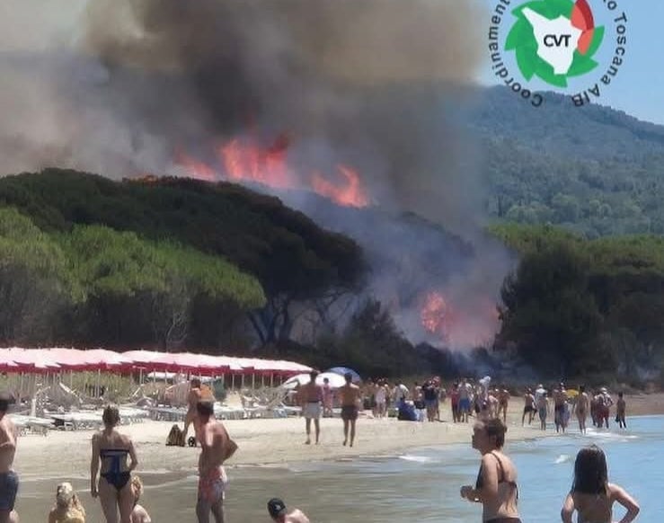 Ein dramatischer Einsatz an der Küste der Toskana: Am Sonntagnachmittag ist in der beliebten Badezone Puntone di Scarlino (Provinz Grosseto) ein großflächiger Brand in der dortigen Pinienwaldzone ausgebrochen. Dichter Rauch stieg über der Küste auf, während sich das Feuer durch starken Wind rasch ausbreitete – der Rauch war kilometerweit bis über den Golf von Follonica sichtbar.