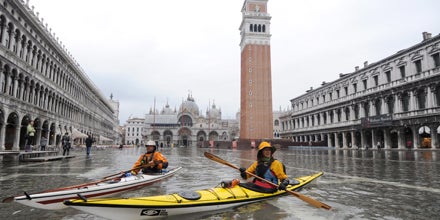 Jetzt könnte es noch schlimmer kommen: Der Zivilschutz befürchtet, dass aufgrund des Regens der längste Fluss Italiens, der Po, über die Ufer treten könnte. Der Wasserpegel steigt immer weiter. Die Po-Ebene ist Italiens wichtigster Wirtschaftsmotor. In der piemontesischen Stadt Alessandria wurde ein Stadtviertel überschwemmt. Die Bahnlinie zwischen Turin und Savona wurde wegen Erdrutschen unterbrochen. In Turin überschritt der Po am Sonntagabend die kritische Schwelle. Dort werden die Schulen aus Sicherheitsgründen heute geschlossen bleiben. Auch Venedig steht unter Wasser – auf dem Markusplatz waren Kanufahrer unterwegs.