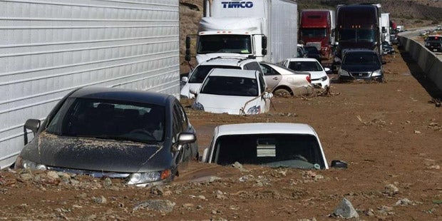 Auf der Route 58, einer wichtigen Ost-West-Verbindung in Südkalifornien, steckten am Freitag fast 200 Fahrzeuge im Schlamm fest, darunter der "Los Angeles Times" zufolge 75 Lastzüge und zwei Busse mit Ausflüglern. Teilweise türmte sich der Schlamm auf diesem Highway-Abschnitt östlich von Tehachapi bis zu sechs Meter hoch. Menschen, die nicht rechtzeitig hatten fliehen können, mussten aus ihren Fahrzeugen befreit werden.