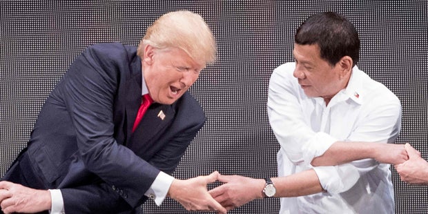 Nun, auf Trumps Asien-Reise, waren die beiden immer wieder zu sehen, wie sie freundlich Hände schüttelten und zusammenstanden. Zur Freude des Gastgebers in Manila zog Trump auch einen golden schimmernden Barong an, das traditionelle Männerhemd auf den Philippinen, das über der Hose getragen wird. Nur beim Familienfoto, als er sich mit Duterte über Kreuz die Hände reichen sollte, tat Trump sich schwer. Das war sehr sinnbildlich, lag aber wohl auch daran, dass Trump damit keine Erfahrung hatte - und an den 25 Zentimetern Größenunterschied zwischen den beiden.