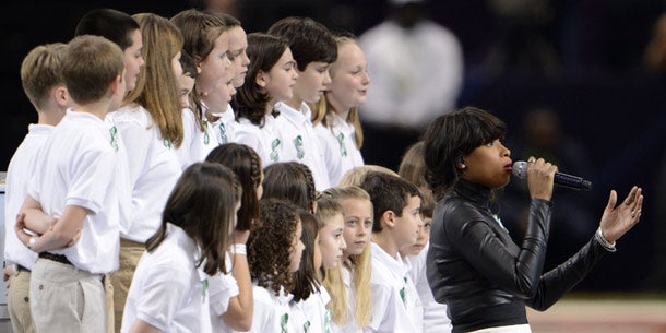 Tränen der Rührung vor dem Super Bowl im Superdome in New Orleans am Sonntag: Überlebende Kinder des schlimmsten Schulmassakers der US-Geschichte an der "Sandy Hook"-Grundschule sangen vor dem Football-Finale gemeinsam mit Jennifer Hudson "America the Beautiful". Mit grünen Schleifen trällerten die Kinder fröhlich das Lied, im Stadion und bei den geschätztem 110 Millionen TV-Zuseheren blieb kaum ein Auge trocken.