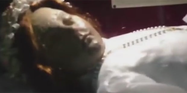 Die Leiche, die zur Präservierung mit Wachs behandelt wurde, sieht aus wie eine Statue. SIe ist jedoch der echte Körper einer kleinen Märtyrerin. Im Video sieht man plötzlich, wie das Mädchen die Augen öffnet.
