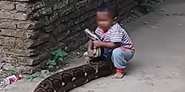 Dieses Video ist nichts für schwache Nerven. Ein Kleinkind aus der indonesischen Provinz Ostjava spielt mit einer riesigen Python. Der kleine Bub sitzt sich dabei auf die Schlange, als ob es sich dabei um ein Spielzeug handelt. Wenig später versucht das Kind sogar, den Kopf der Python zu heben.