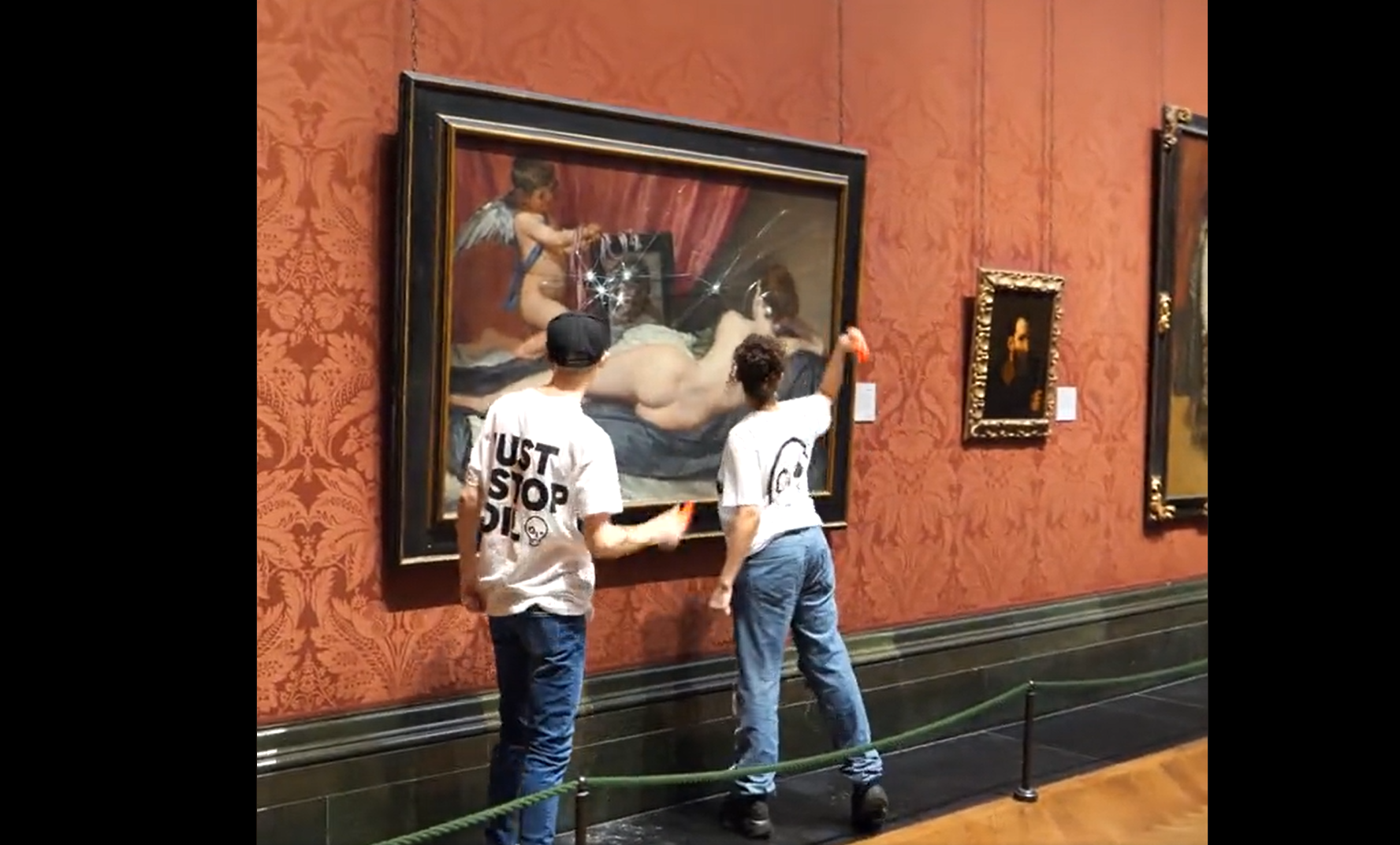 Die Gruppe Just Stop Oil veröffentlichte ein Video der Aktion. Zu sehen ist, wie ein Mann und eine Frau in der Londoner National Gallery mit Hämmern den Schutz von "Venus vor dem Spiegel" beschädigen.