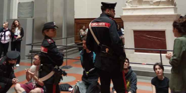 Vier Aktivisten ketteten sich in der Galleria dell'Accademia an das Geländer, das Michelangelos David-Statue schützt, und entrollten ein Transparent. Vier weitere Aktivisten verteilten Flugblätter. Die Carabinieri griffen kurz darauf ein, das Museum wurde vorübergehend geschlossen.