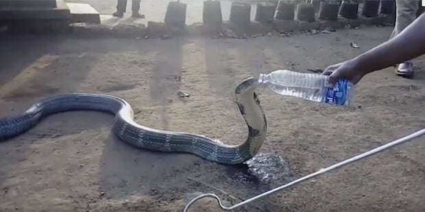 Ein paar mutige (oder lebensmüde) Männer erkannten die missliche Lage des Tieres und griffen beherzt ein. Mit einer Plastikflasche gaben sie der Schlange zu trinken. Wie ein Schoßhündchen trinkt das majestätische Tier aus der Flasche. Die Bilder gehen derzeit um die Welt.