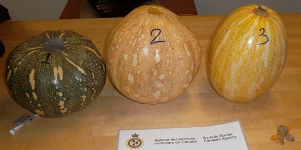 Kürbisse als Drogenversteck: Pünktlich zu Halloween haben kanadische Zöllner Kokain in ausgehöhlten Kürbissen gefunden. Die Beamten beschlagnahmten fast zwei Kilogramm des Suchtgifts bei einer einreisenden Frau, wie die Grenzbehörde am Freitag bestätigte.