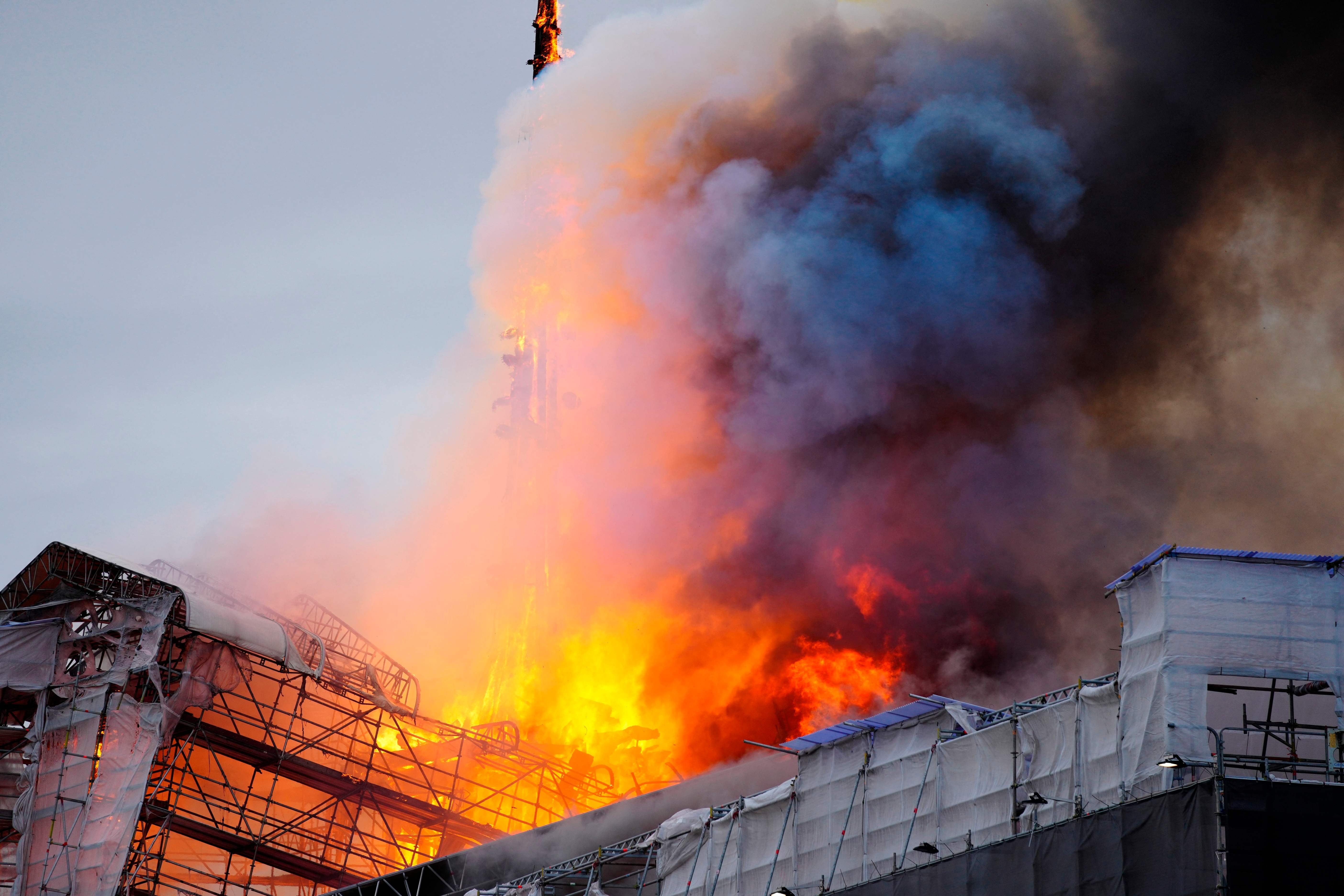 Die 400 Jahre alte Börse in Dänemarks Hauptstadt fing heute Morgen Flammen, Dach und Turm stürzten bereits ein. Die Löscharbeiten dauern bis dato an.