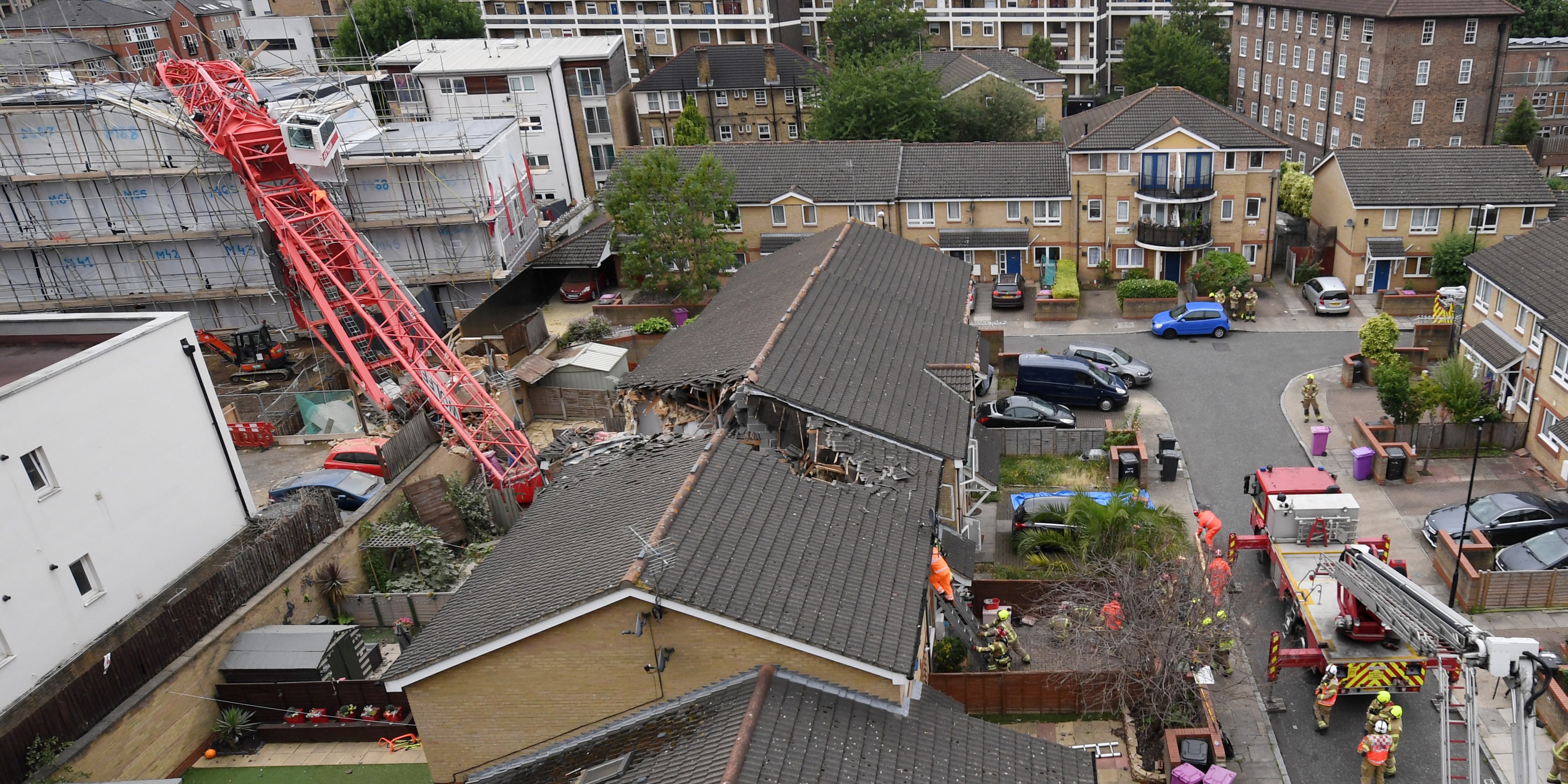 Crane behind my building just collapsed in Bow, London. At least one man crushed, crane went through 2 house. pic.twitter.com/pOBF4LcZmc
