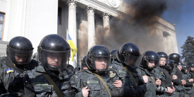 Mehrere tausend Demonstranten haben sich am Dienstag in der ukrainischen Hauptstadt Kiew vor dem Parlament eine Straßenschlacht mit der Polizei geliefert. Die zum Teil vermummten Demonstranten zogen vor das Hauptportal des Parlaments und bewarfen das Gebäude und die Polizei mit Steinen und Rauchbomben und schossen mit Luftgewehren. Die meisten Fenster im ersten Stock gingen dabei zu Bruch.