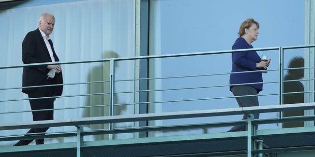 Merkel und Seehofer zeigten sich wenige Minuten nach dem Eintreffen kurz auf einem Balkon des Kanzleramts. Seehofer war im Anzug, aber ohne Krawatte erschienen, Merkel im blauen Blazer. Beide hatten Gläser in der Hand, Merkel offensichtlich mit Weißwein, ihre Mienen wirkten aber angestrengt. Hintereinander strebten sie einem Saal des Kanzleramts zu, in dem sie sich zum Gespräch zurückzogen. Die blickschützenden Gardinen wurden rasch zugezogen.