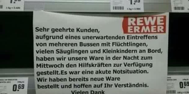 In der Nacht auf Mittwoch räumte ein Supermarkt in Deutschland seine Regale quasi leer, um ausreichend Gläschen, Milchpulver und Windeln den Flüchtlingen zur Verfügung stellen zu können. Eine spontane Aktion mit großer Wirkung: Die verdutzten Kunden wurden mittels eines Hinweis-Schilds auf die Aktion aufmerksam gemacht: „Sehr geehrte Kunden, aufgrund eines unerwarteten Eintreffens von mehreren Bussen mit Flüchtlingen, vielen Säuglingen und Kleinkindern an Bord, haben wir unsere Waren in der Nacht zum Mittwoch den Hilfskräften zur Verfügung gestellt. Es war eine akute Notsituation. Wir haben bereits neue Waren bestellt und hoffen auf Ihr Verständnis. Vielen Dank.“