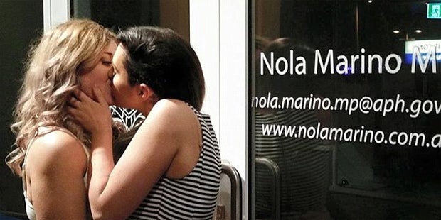 Ein leidenschaftlicher Kuss geht derzeit dank Facebook um die Welt. Ein lesbisches Pärchen küsste sich in Australien vor dem Büro von Nola Marino, einer Anti-Homo-Aktivistin, die erst vergangene Woche erklärte, Australien sei noch nicht bereit für die Homo-Ehe.