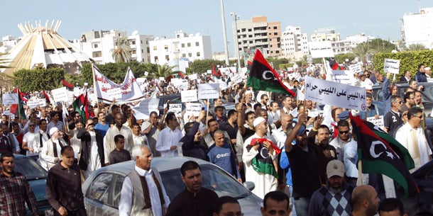 Sie zogen mit weißen Flaggen als Zeichen ihrer Friedfertigkeit sowie mit den Landesflaggen auf die Straße und sangen gemeinsam die Nationalhymne. Vom Meliana-Platz zogen die Demonstranten zum Hauptquartier der besonders berüchtigten Misrata-Miliz im südlichen Stadtteil Gharghur.