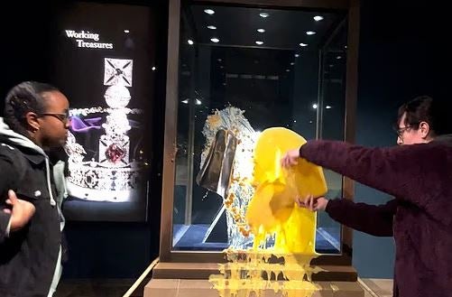Vier Aktivisten wurden festgenommen, nachdem sie heute Morgen Apfelcrumble und Vanillepudding über die Glasvitrine der Kronjuwelen im Tower of London geworfen hatten. Die Gruppe fordert eine stärkere Besteuerung der Reichen.